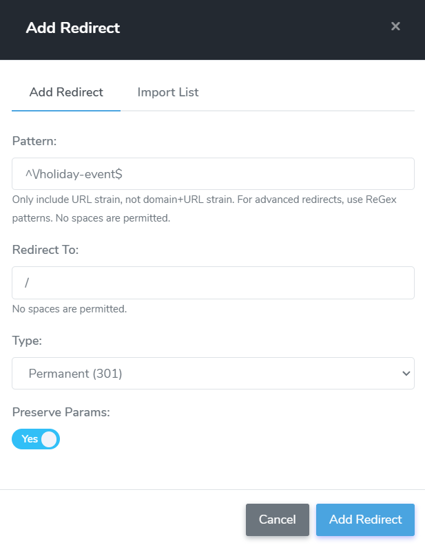 - If you get a "Please provide a valid pattern." error message when attempting to save, make sure your redirect has no spaces.